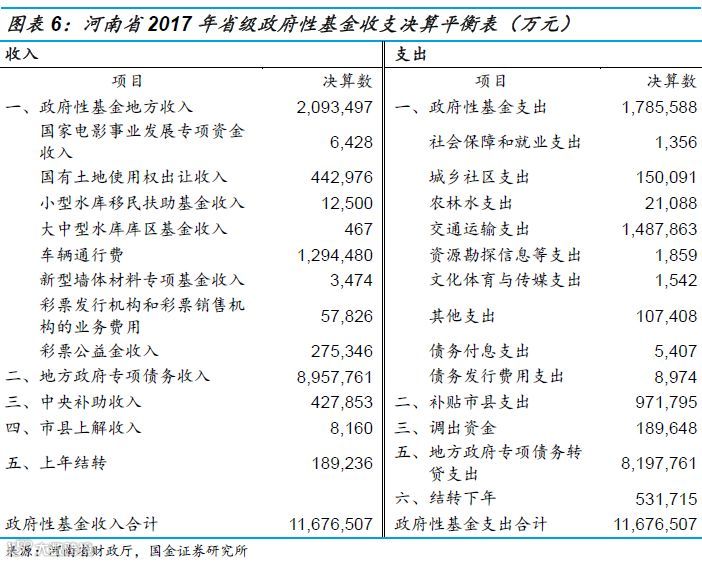 地方综合财力上,考虑到口径的统一性,我们采用计算三种财力的方式进行计算。以贵州省为例,2017年地方综合财力6,016.45亿元,其中公共财政财力4,913.01亿元,基金财力1,094.19亿元,国有资本经营财力9.25亿元。