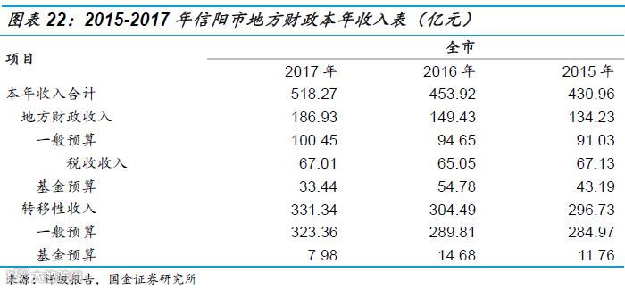 2017年信阳市经济继续保持增长,实现财政总收入148.38亿元,同比大幅增长16.3%。2017年信阳市财政本年收入同比继续增加,其中转移性收入占比为63.93%,占比依然较高,信阳市对上级转移支付的依赖程度仍然很高。