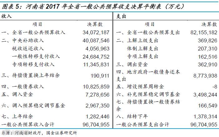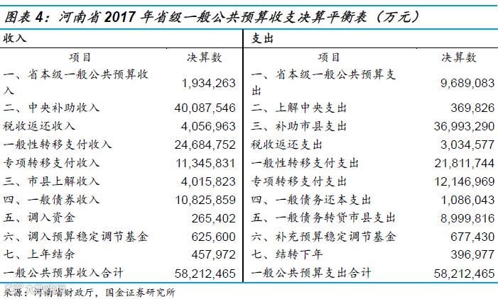 我们以河南省为例,汇总2017年省级一般公共预算收支平衡表。这里需要注意的是,地方各级总预算由本级政府预算和汇总的下一级总预算组成。如果把省级和下属各市县预算收支加总,我们可以得到河南省全省一般公共预算收支平衡表。两张表中的中央补助收入和上解中央支出是相等的,而本省内部(省级与市县之间)发生的转移性收支,如市县上解收入、补助市县支出等项目在加总时可以合并约去。因此,省级收支平衡表能够反映省级政府对上级(中央)和下级(河南省各市县)的财政勾稽关系,而全省收支平衡表则简化为整个河南省对上级(中央)的财政勾稽关系。