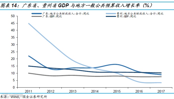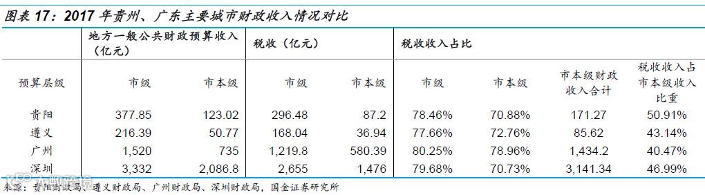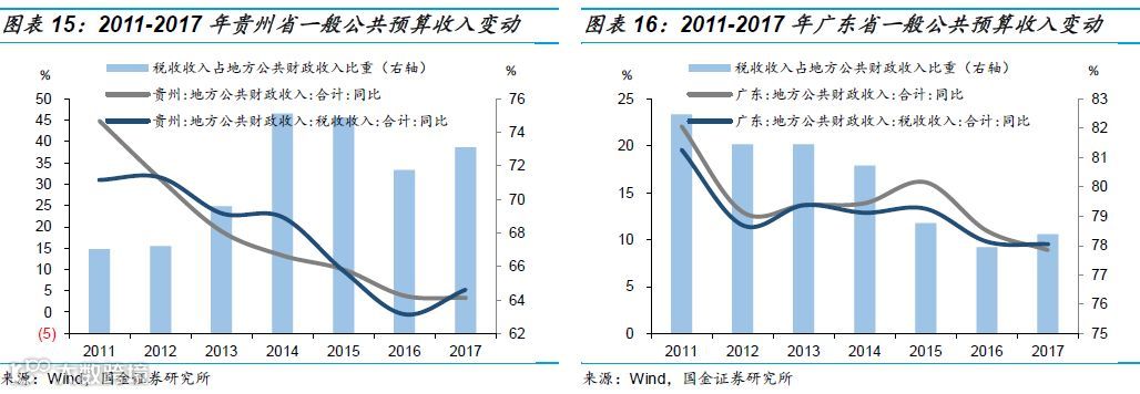 由于两省对于地方财政总收入的统计口径并不一致,我们采用广东省的口径,即地方财政总收入=一般公共预算收入+政府性基金收入,比较税收收入对两省财政总收入的影响。贵州省2016、2017年税收收入占地方财政总收入的比重为49.2%、45.8%,广东省为56.8%、52.4%。显然,贵州省的收入结构要差一些,同时由于基金收入占比过高,财政总收入波动更大。
