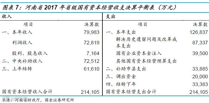 国有资本经营预算收入是指经营和使用国有财产取得的收入,主要包括国有独资企业按规定上缴国家的利润,国有控参股企业国有股权上缴的股利、股息收入,国有产权转让收入和清算收入。国有资本预算收入规模较小,大多返还给企业,地方政府可用规模较小。如河南省2017年省本级国有资本经营收入合计21.41亿元,其中国有资本地方经营收入仅8亿元,其余大部来自于中央补助收入和上年结转收入。
