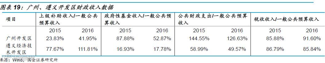 对于园区我们主要关注公共财政收入结构,上级转移支付收入和土地财政情况。对比广州开发区和遵义经济技术开发区的财政数据,主要结论如下: