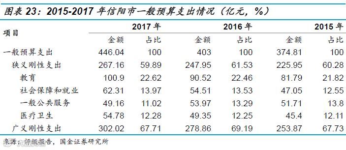 2017年,信阳市实现一般预算支出446.04亿元,同比增长10.68%;其中狭义刚性支出与广义刚性支出规模均继续增加但占比均有所下降。同期,信阳市教育支出为100.90亿元,在一般预算支出中的占比为22.62%,仍然是狭义刚性支出最主要的部分。2017年,广义刚性支出占比为67.71%,虽有小幅下降但仍保持较高水平。