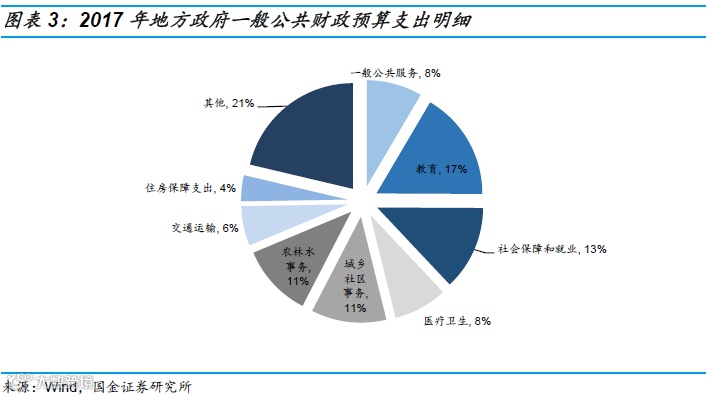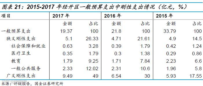 支出一般按功能进行分类,强调民生支出的变动,有评级报告中进一步对财政支出进行狭义刚性和广义刚性进行分类。将社会保障与就业、医疗卫生、教育和一般公共服务四个支出科目定义为狭义刚性支出,将狭义刚性支付加上一般预算支出中外交、国防、公共安全、科学技术、文化教育与传媒、环境保护等科目,但不包括城乡社区事务、农林水事务、交通运输和工业商业金融(采掘电力信息、金融监管支出)等事务四个科目,定义为广义刚性支出。