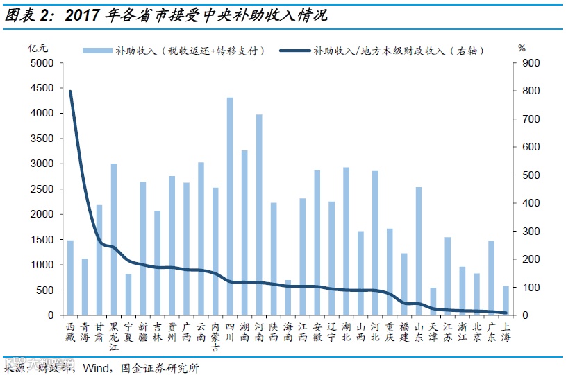 ①上级补助收入:指上级政府财政按照财政体制规定或因专项需要补助给本级政府财政的款项,包括上级税收返还、一般性转移支付和专项转移支付。税收返还一般与地方政府上缴的税收收入成正相关。补助收入是地方财政收入的重要来源,例如2017年中央对地方税收返还和转移支付为65,804.88亿元,而当年地方本级收入91,469.41亿元,两者之比接近3:4。横向比较来看,31个省市接受中央补助收入情况差异较大,经济基础差、财政收入薄弱的西藏、青海、甘肃、黑龙江等地,中央补助收入与地方本级财政收入的比值超过了200%。