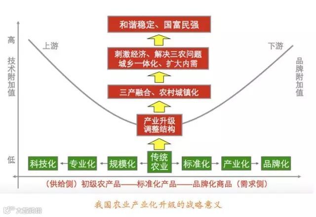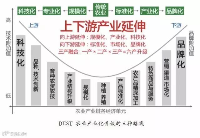 我国农业产业化升级路线:上下游产业延伸和三产融合。农业产业延伸的过程,就是实现科技化创新、专业化生产、规模化种养、标准化控制、产业化经营、品牌化销售、社会化服务的过程,就是借用工业化理念来指导发展农业的过程。