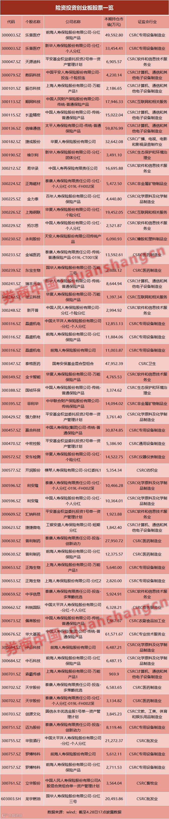 重仓个股方面,乐普医疗、华大基因、信维通信、泰格医疗等位列险资重仓股持仓市值前列,仅华大基因,中国人寿持仓市值就达到6.2亿元。