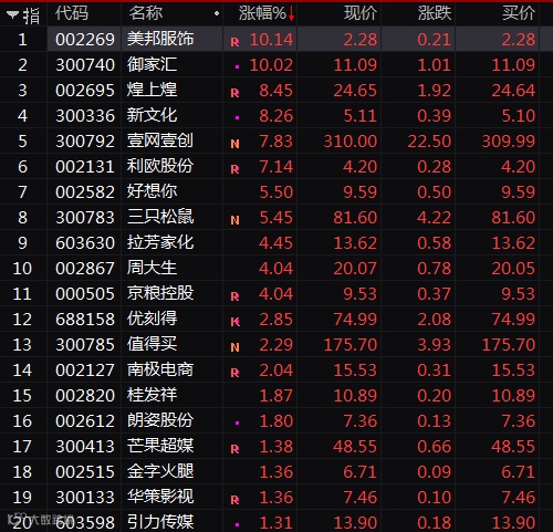 受此影响,网红经济板块也快速拉升,截至收盘,美邦服饰、御家汇涨停,煌上煌、新文化涨逾8%,壹网壹创、利欧股份涨逾7%,好想你、三只松鼠涨逾5%。