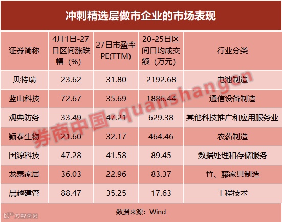 从涨跌幅来看,4月以来(截至27日)晨越建管涨幅达到88.47%,排名第三。蓝山科技大涨72.67%,国源科技涨47.28%。龙泰家具与观典防务均涨30%以上。