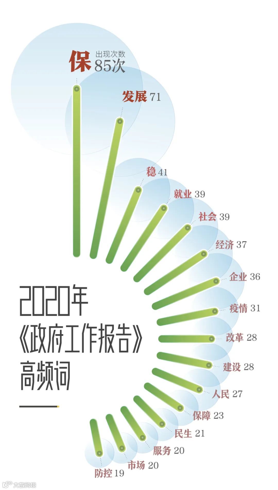 “稳就业、保民生”贯穿整份报告。在2020年《政府工作报告》中,“保”是出现频次最高的词,共出现85次。