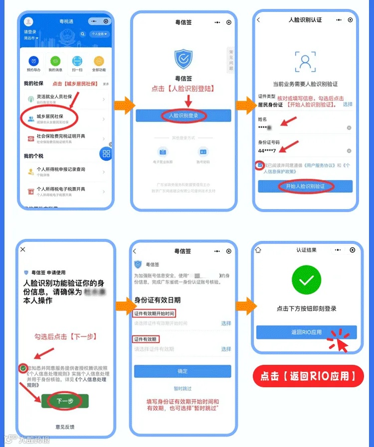 第一步:进入“粤税通”小程序,点击【城乡居民社保】,跳转“粤信签”小程序按提示完成【人脸识别登录】,点击【返回RIO应用】。