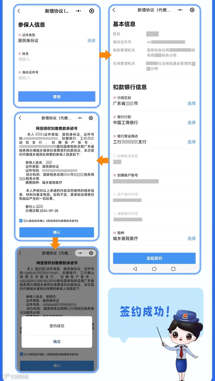 第三步:录入需要签约代缴城乡居民社保费的参保人信息,点击【查询】,确认“基本信息”,选择开户银行所在地的“行政区划”,选择“银行行别”和“银行营业网点”,输入“划缴账户账号”,选择需要代缴费的“险种”(可以选择“全部”、城乡居民养老或城乡居民医疗),点击【发起签约】,阅读承诺书内容,勾选“已认真阅读并确认《网签授权划缴费款承诺书》”,点击【确认】弹出“签约成功”提示即成功签约。