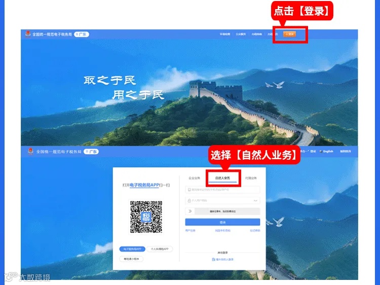 第一步:进入新电子税务局,点击右上角【登录】,以“自然人业务”进入办理缴费。