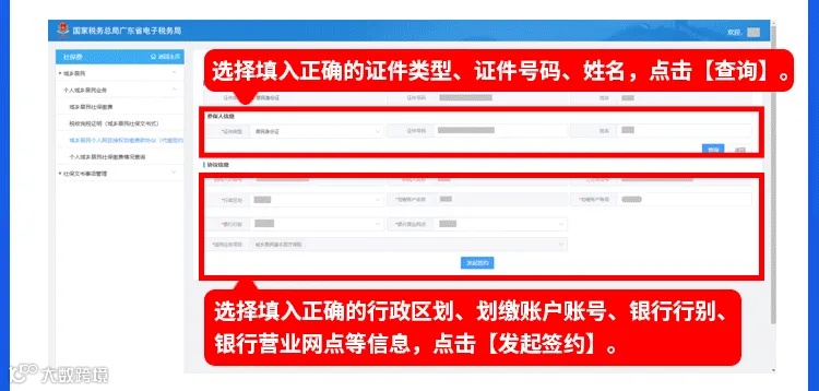 第四步:点击【新增代缴协议】,录入需要签约代缴城乡居民社保费的参保人信息,点击【查询】,录入协议信息,选择开户银行所在地的“行政区划”,输入“划缴账户账号”,选择“银行行别”和“银行营业网点”,如参保人同时参加城乡居民养老和城乡居民医疗保险,则需要选择代缴费的“适用征收项目”,点击【发起签约】。