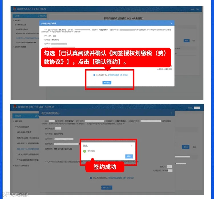 第五步:进行委托代缴签约确认,点击《网签授权划缴税(费)款协议》阅读协议内容,勾选“已认真阅读并确认《网签授权划缴税(费)款协议》”,点击【确认签约】,弹出“签约成功”提示即成功签约。