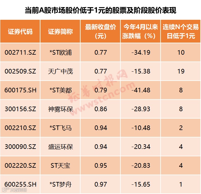 与此同时,另一家A股上市公司天广中茂(002509.SZ)5月8日则是连续第19个交易日收盘价低于面值,股价仅收报0.77元,即便下一个交易日涨停,也铁定将触及面值退市标准。
