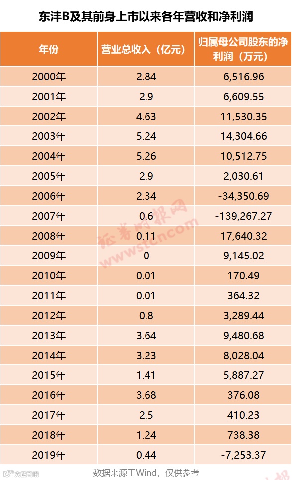 数据显示, 东沣B及其前身上市以来,其营收总体未有增长,甚至有所萎缩,最近几年东沣B净利润更是徘徊在微利和亏损之间,经营情况不佳。
