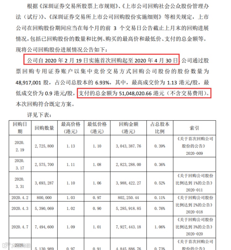公告显示,东沣B自2020年2月19日实施首次回购起至2020年4月30日,通过股票回购专用证券账户以集中竞价交易方式回购公司股份的股份数量为48,917,001股,占公司总股本的6.93%,其中,最高成交价为1.13港元/股,最低成交价为0.9港元/股,支付的总金额约为5104.8万港元(不含交易费用)。