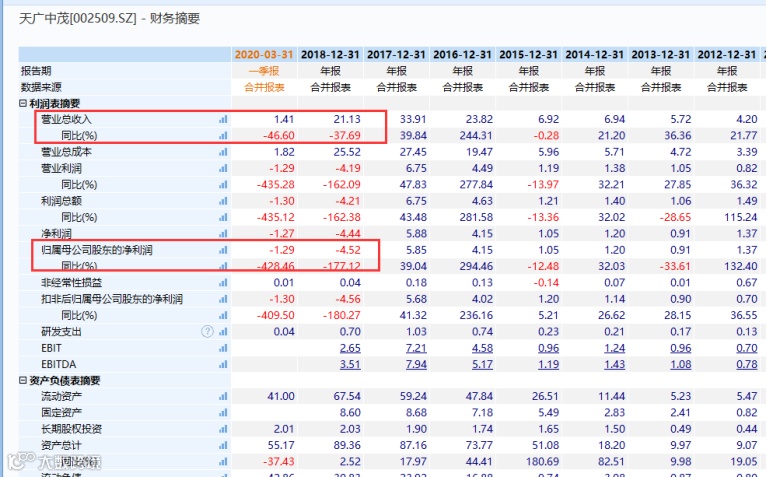 根据公开资料,天广中茂的业绩此前一些年份比较稳定,自2018年后开始显著恶化,营收和利润均开始下滑,当年年度营收同比下降37.69%,并出现4.52亿元的亏损。2020年一季度,公司再度亏损1.29亿元,但对于2019的正式年报,公司如今尚未披露。