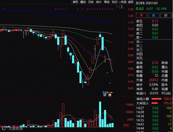 行情数据显示,B股上市公司东沣B(200160.SZ)5月8日继续跌停,收盘仅报0.62港元。此前一天晚间,公司发布公告称,其股票已经连续19个交易日(自2020年4月8日至5月7日)收盘价格均低于每股1元人民币面值。这意味着截至5月8日收盘,公司股价已连续20个交易日低于面值,正式触及面值退市标准。