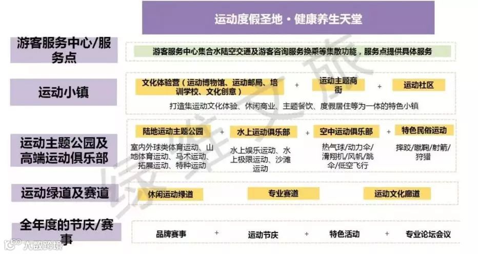 休闲运动度假的核心是体育与休闲运动,基于此,用旅游思维和理念包装运动街区、运动小镇、运动主题公园、高端俱乐部、运动节庆/赛事、运动绿道及赛道等,以“健康养生”为主要目的,打造集运动养生、旅游观光、休闲体验、度假居住、休闲商业、主题餐饮、特色运动等为一体的运动度假综合体,其盈利结构为:运动设备租赁、赛事举办、度假居住及服务等。