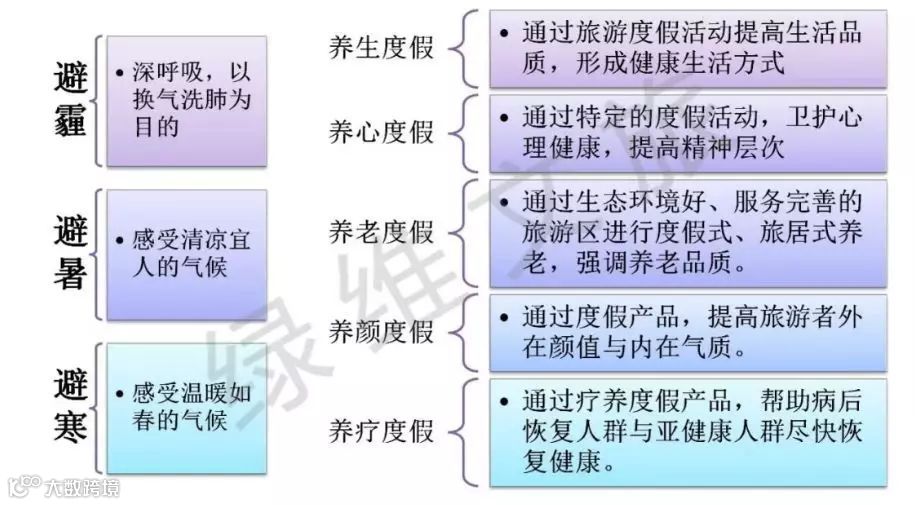 在大健康时代,人们对于养生和大健康的需求已不单单是治疗,而是表现在预防、治疗、修复、康养的“四结合”,即康养旅游的“三避五养+微度假”模式。