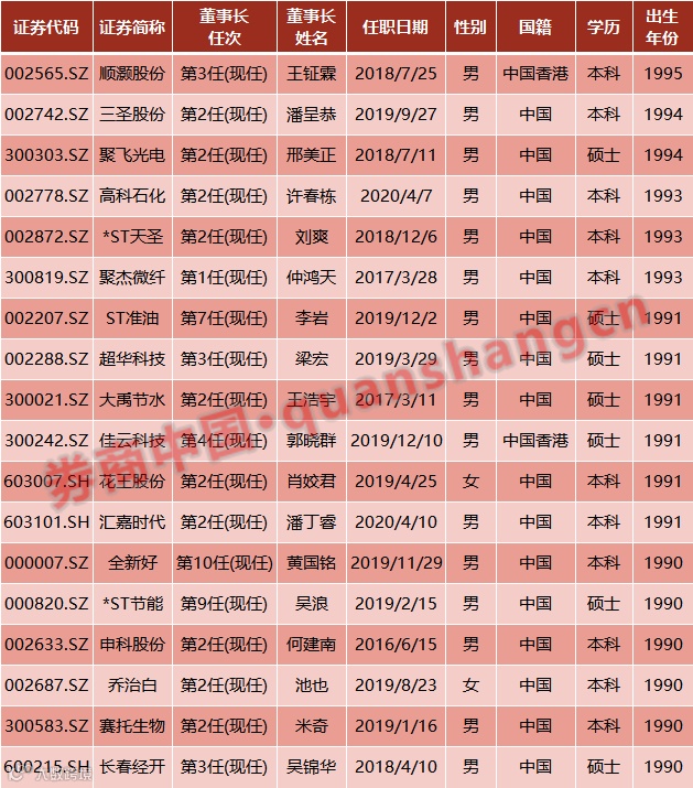 事实上,在波涛汹涌的资本市场上,早已少不了青年们的身影。按照30岁的标准来衡量青年的范畴,“90后”(20-30岁)仍是青年的最好代表。券商中国记者统计发现,目前A股市场上已有18名90后董事长,不得不令人感慨后生可畏。