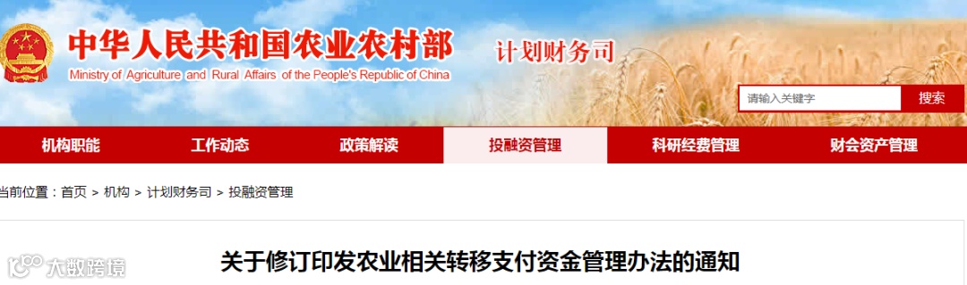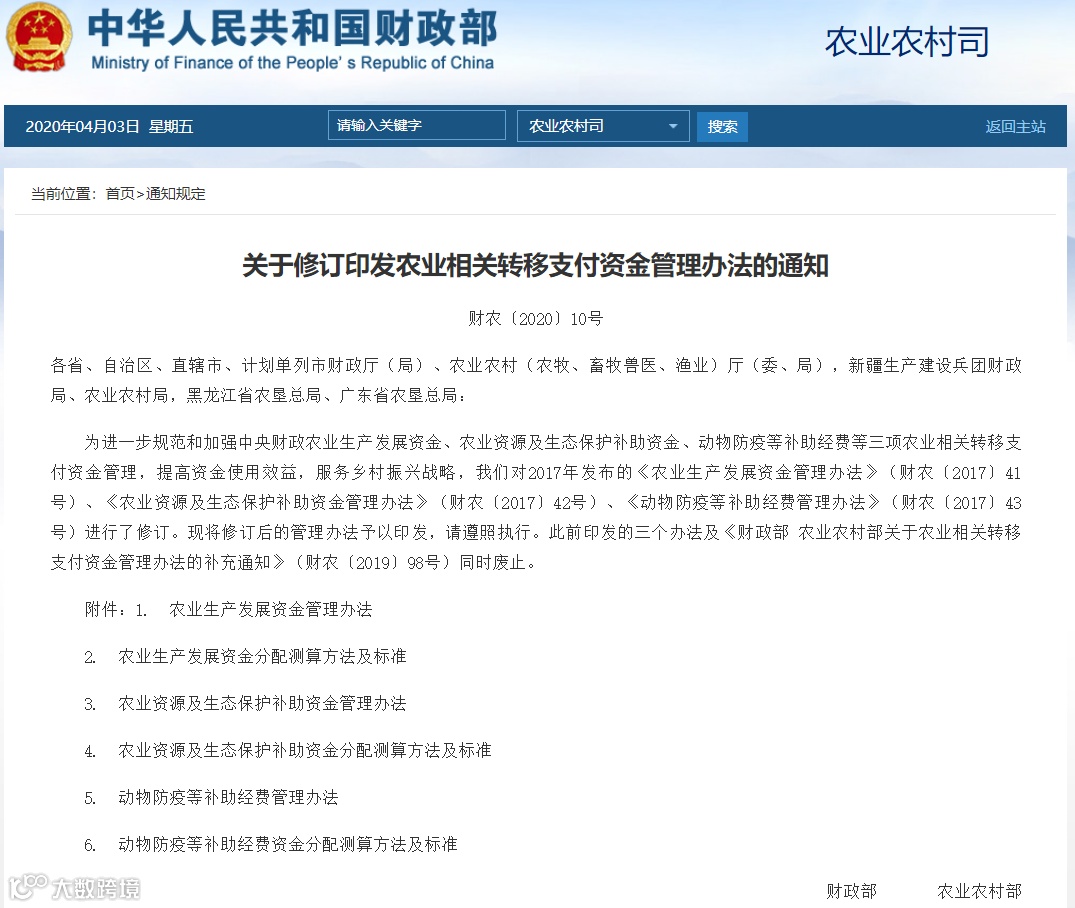 近日,财政部、农业农村部修订印发《农业相关转移支付资金管理办法》,进一步规范和加强中央财政农业生产发展资金、农业资源及生态保护补助资金、动物防疫等补助经费等三项农业相关转移支付资金管理,提高资金使用效益,服务乡村振兴战略。