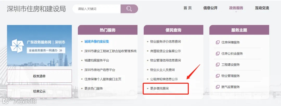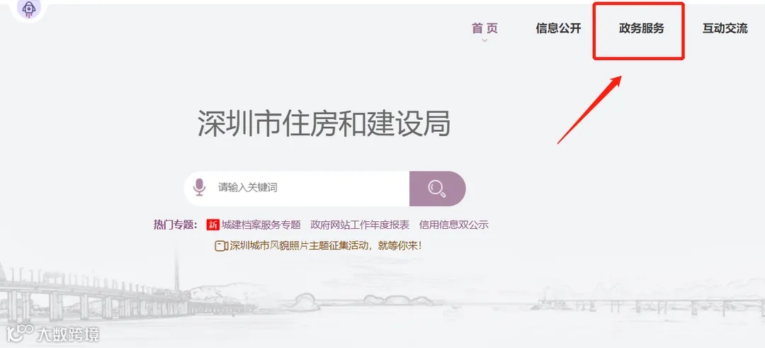 在深圳市住建局官网(http://zjj.sz.gov.cn/)首页,点击右上角的【政务服务】;