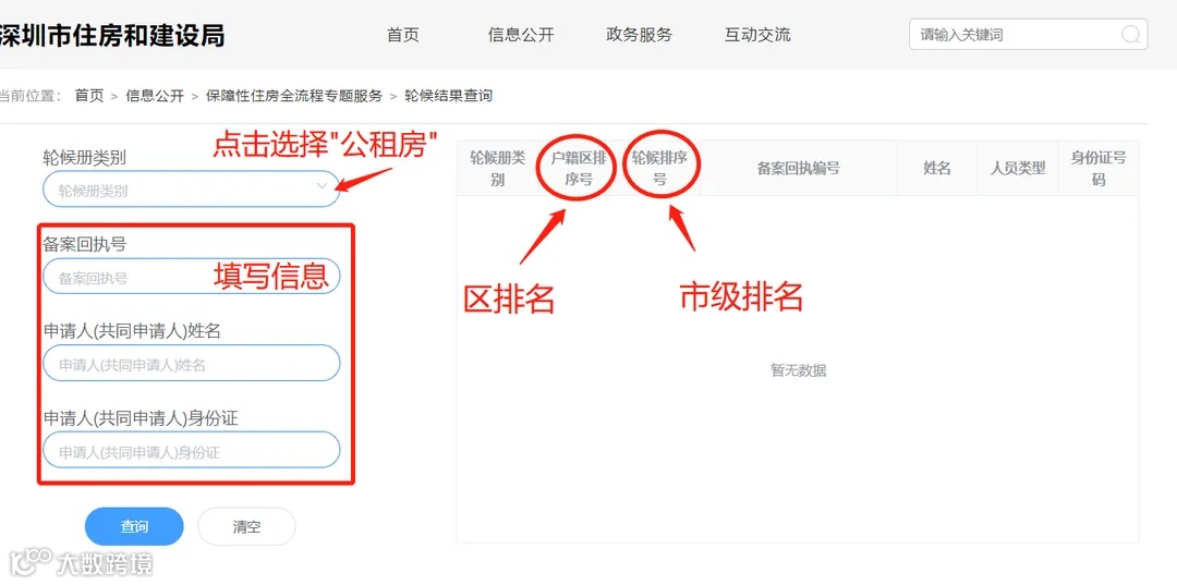 进入查询页面,选择轮候册类别为"公租房",接着输入备案回执号、申请人或共同申请人的姓名和身份证号码,点击【查询】就可以看到自己的排名了