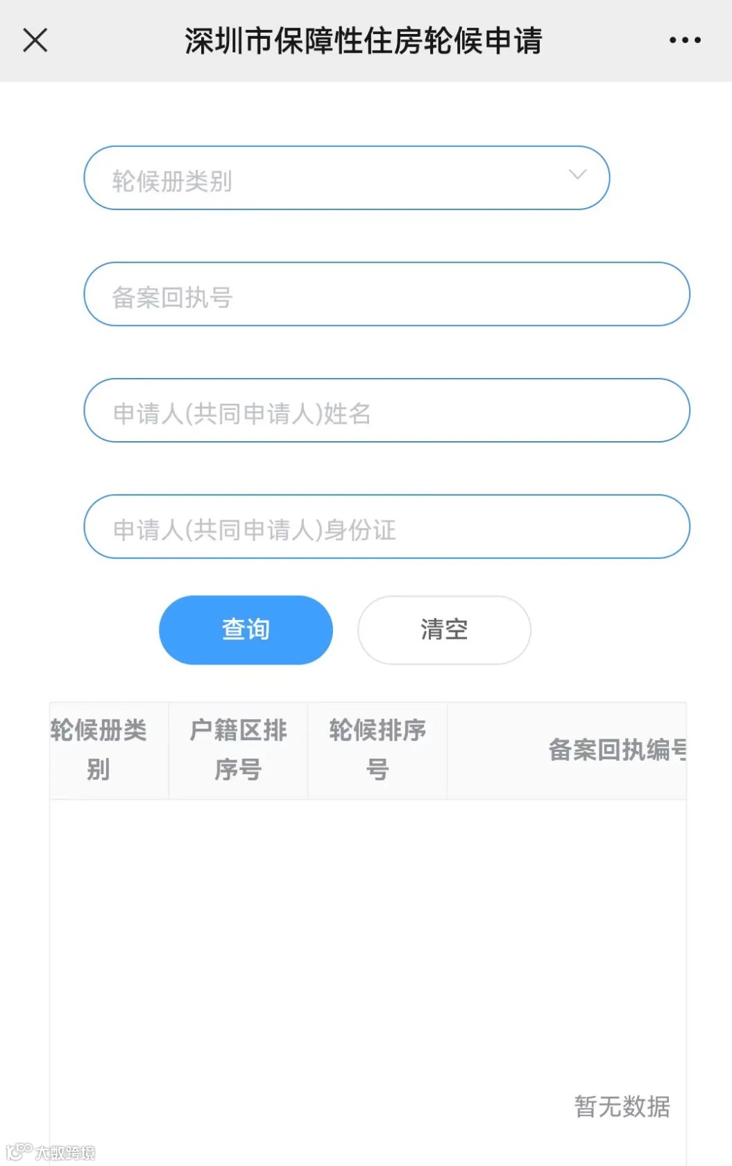 点击【轮候结果查询】进入信息查询页面,和官网查询一样,选择轮候册类别为"公租房",接着输入备案回执号、申请人或共同申请人的姓名和身份证号码,就可以看到自己的排名了