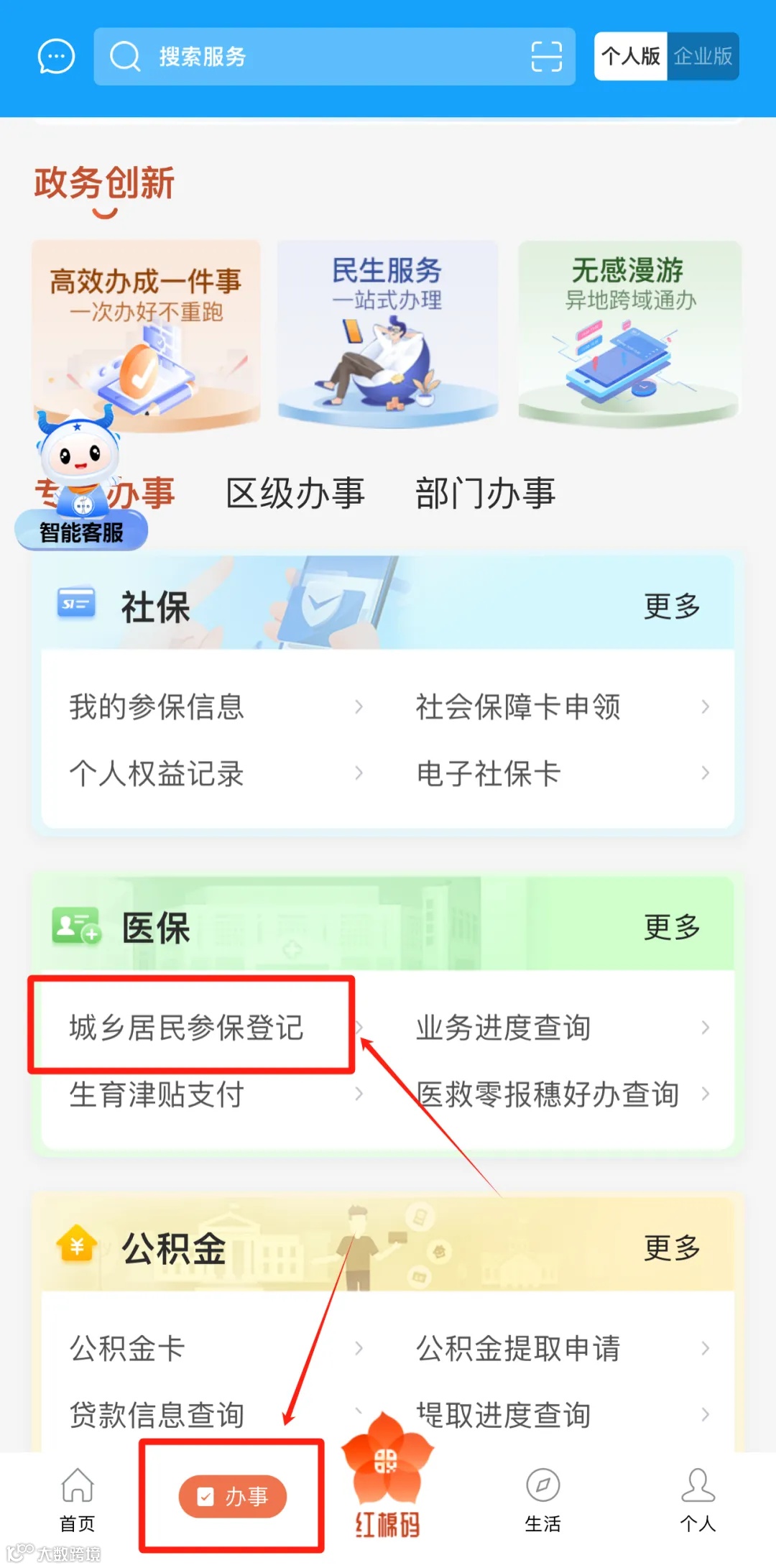 💠第二步:在办事页面的【医保】专栏中找到并点击“城乡居民参保登记”,如下图所示;