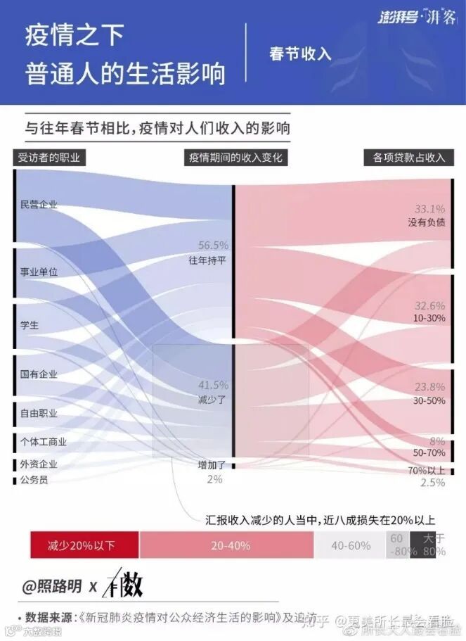 除了没有时间,现在普罗大众更大的恐慌是没有钱。本次新冠疫情被称为“黑天鹅事件”,对社会经济和个人消费水平造成的影响不容小觑。调查研究显示,疫情让超四成人口的收入锐减,其中近八成人的损失在20%以上,他们大多拥有一定的负债。