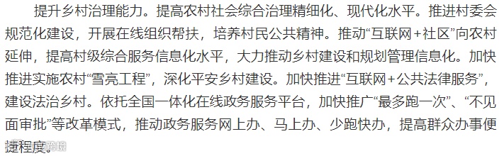 推动“互联网+党建”。建设完善农村基层党建信息平台,优化升级全国党员干部现代远程教育,推广网络党课教育。推动党务、村务、财务网上公开,畅通社情民意。