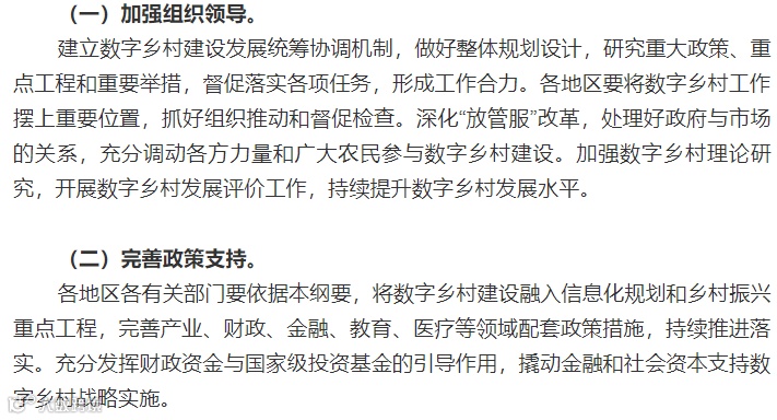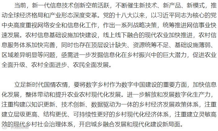 数字乡村是伴随网络化、信息化和数字化在农业农村经济社会发展中的应用,以及农民现代信息技能的提高而内生的农业农村现代化发展和转型进程,既是乡村振兴的战略方向,也是建设数字中国的重要内容。为贯彻落实《中共中央、国务院关于实施乡村振兴战略的意见》、《乡村振兴战略规划(2018-2022年)》和《国家信息化发展战略纲要》,特制定本纲要。
