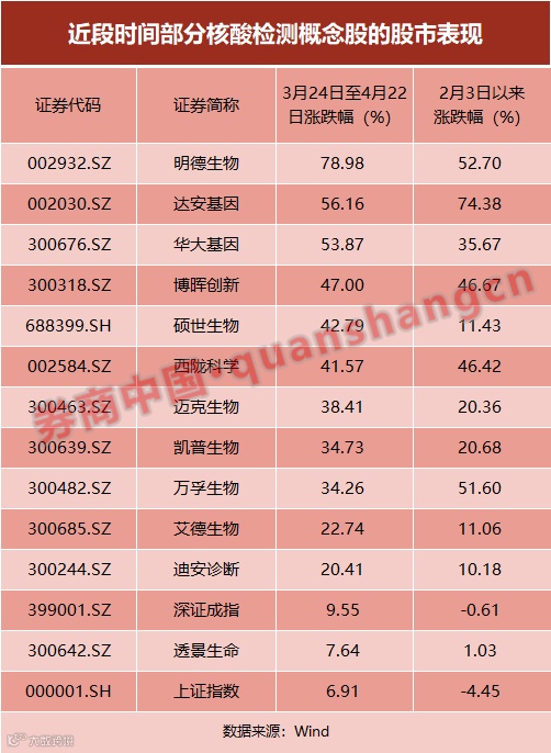 近几日来,随着多地加大核酸检测力度,已有个别个股异动走强。4月20日早盘,博晖创新(300318)、达安基因(002030)等多股涨停,透景生命(300642)股价暴涨超过8%;4月21日,明德生物、西陇科学、博晖创新涨停;4月22日,明德生物涨幅依然超过7%。