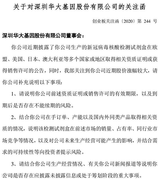 甚至有核酸检测概念股“树大招风”,新近收到了深交所的关注函。22日晚间,深交所对华大基因下发关注函,要求其补充说明生产的新冠病毒核酸检测试剂盒近期在多国取得相关资质证明或获得销售许可的相关事项。