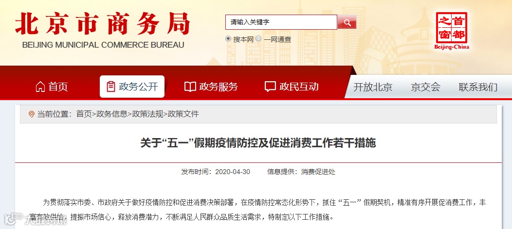 据了解, 4月30日北京市商务局发布的《关于“五一”假期疫情防控及促进消费工作若干措施》(下称《措施》)提出,在做好消费场所疫情防控措施的同时,安全有序开展促消费活动。其中提出要促进品牌和品质、免税商品、餐饮、社区、跨境、老字号等六大领域的消费。