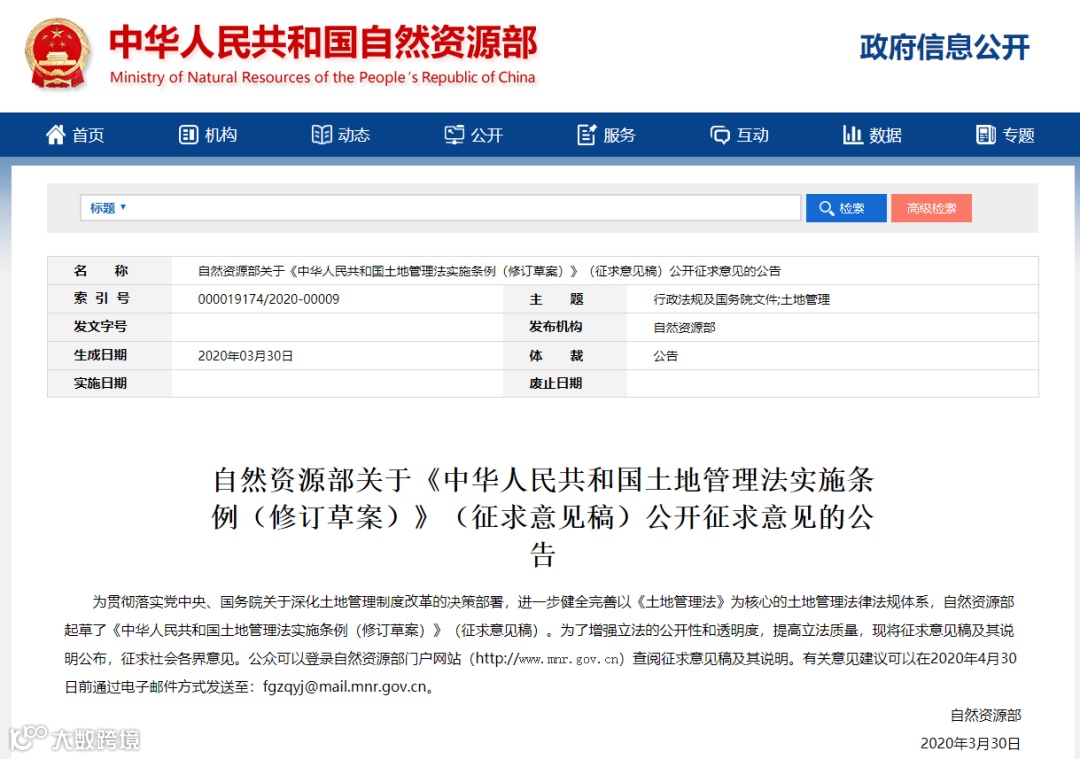 为贯彻落实党中央、国务院关于深化土地管理制度改革的决策部署,进一步健全完善以《土地管理法》为核心的土地管理法律法规体系,自然资源部起草了《中华人民共和国土地管理法实施条例(修订草案)》(征求意见稿)。为了增强立法的公开性和透明度,提高立法质量,现将征求意见稿及其说明公布,征求社会各界意见。公众可以登录自然资源部门户网站(http://www.mnr.gov.cn)查阅征求意见稿及其说明。有关意见建议可以在2020年4月30日前通过电子邮件方式发送至:fgzqyj@mail.mnr.gov.cn。