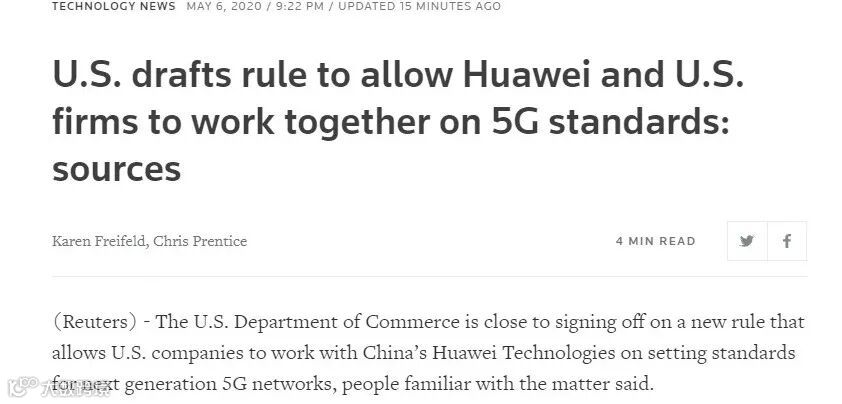 据路透社报道,美国商务部即将签署一项新规则,该规则允许美国公司与中国的华为技术公司合作,为下一代5G网络设定标准。
