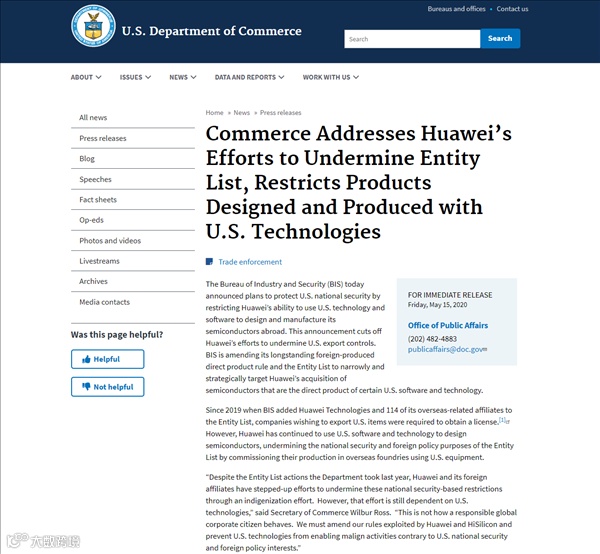 美国商务部部长威尔伯·罗斯称:“尽管美国去年采取了(将华为列入)‘实体清单’的措施,但是华为及其海外关联机构通过一系列本土化举措,削弱了这些涉及国家安全的限制。这不是一家负责任的企业的所作所为。我们必须修订被华为和海思利用的规则漏洞,保护美国技术免受恶意利用,威胁美国国家安全和海外利益。”