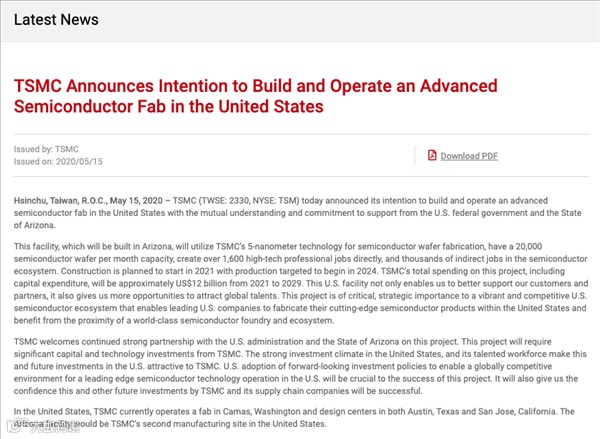 就在此次美国推出限制升级之前,5月15日,台积电在官网正式宣布,在美国联邦政府及美国亚利桑那州的共同理解和其承诺支持下,计划在美国兴建并运营一个先进的晶圆厂。