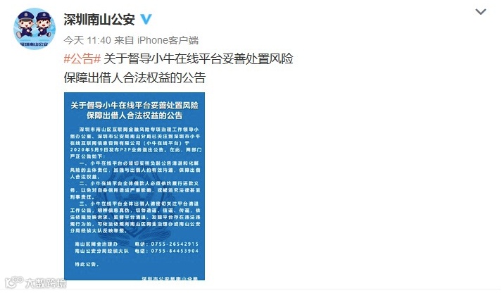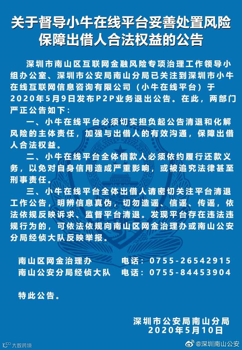 5月11日,深圳警方在官方微博发文称将督导风险处置。深圳南山区互联网金融风险专项治理工作领导小组办公室与深圳市公安局南山分局明确,要求小牛在线一定严格按照监管要求、落实清退主体责任,加强与出借人的有效沟通,保障出借人合法权益。要求还提到,平台全体借款人必须依约履行还款义务,以免对自身信用造成严重影响,或被追究法律甚至刑事责任。