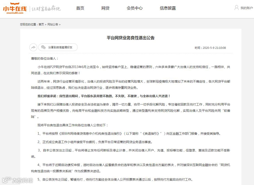 已上线近7年的广东知名网贷平台小牛在线突然宣布“良性”退出。