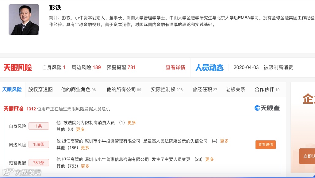 天眼查司法风险显示,彭钢自身风险有12条,周边风险高达3278条;因小牛新财富管理有限公司和深圳市小牛投资管理有限公司数度被法院列为限制高消费人员。
