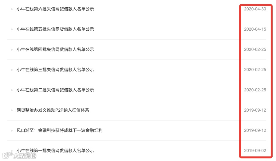 券商中国记者注意到,早在去年9月底,小牛在线的官网就挂出第一批失信网贷借款人名单。今年2月25日,正值新冠疫情肆掠时,小牛在线又集中披露了三批失信网贷借款人名单,资产端的违约危机和催收压力之大已经显现。进入4月份,小牛在线又披露了两批失信债权人名单,情况进一步恶化。