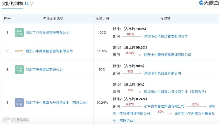 天眼查显示,小牛资本管理集团有限公司法定代表人彭钢,在147家公司担任高管,在20家公司担任股东,在32家公司担任法人,大多是小牛系的公司,但他拥有实际控制权的公司只有14家。