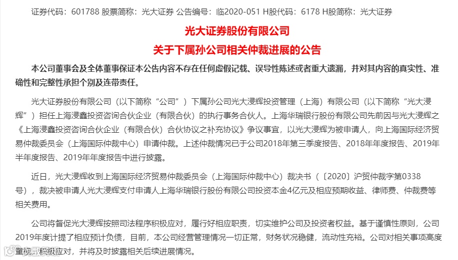 光大证券在两份公告中均表示,将督促光大浸辉按照司法程序积极应对,履行好相应职责,切实维护公司及投资者利益。基于谨慎性原则,光大证券2019年度计提了相应预计负债,目前经营管理情况一切正常,并将及时披露相关后续进展情况。