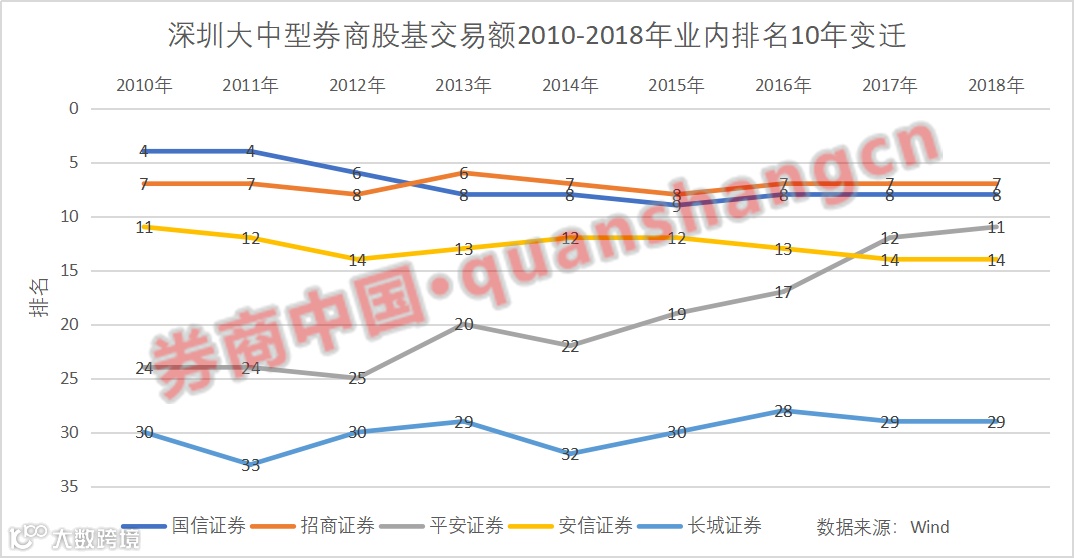 不仅综合实力落后,深圳券商在多个单项业务上也逐渐失去话语权。曾因“银证通”做强经纪业务的国信证券,股基交易额2005-2011年一直排名前5,但近五年已经掉至第8-9位。