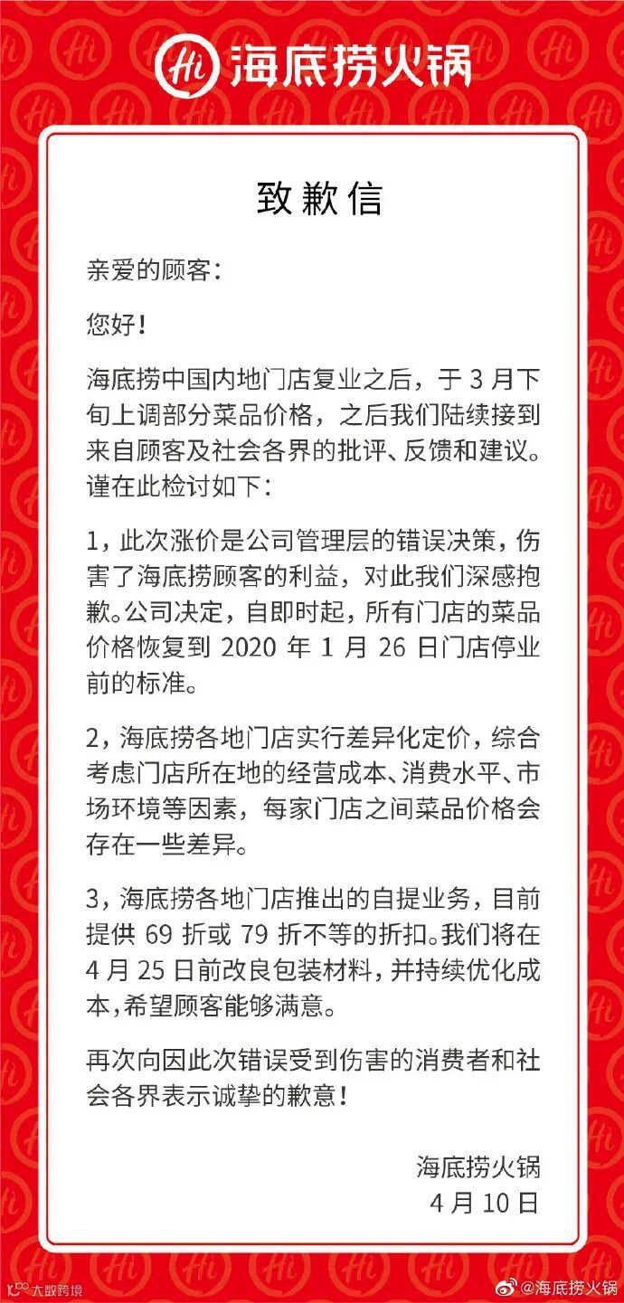 海底捞今日发布致歉信:海底捞门店此次涨价是公司管理层的错误决策,伤害了海底捞顾客的利益。对此我们深感抱歉。自即时起,中国内地门店菜品价格恢复到今年1月26日门店停业前标准。